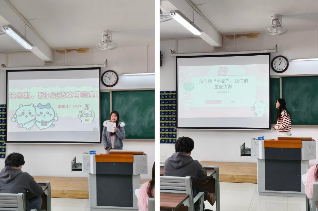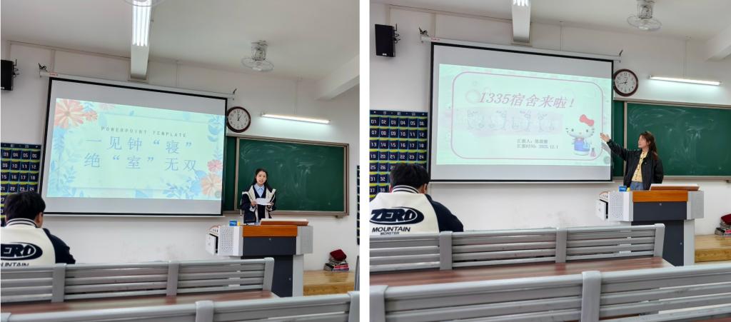 12月1日,现场汇报环节在一教 411、412 教室正式开启。各参赛寝室汇报人思路清晰,生动阐述寝室设计方案。汇报现场氛围融洽,参赛成员们不仅展现出默契的团队协作,更分享了寝室获得的各类奖项及参与班级建设的经历,赢得评委一致好评。