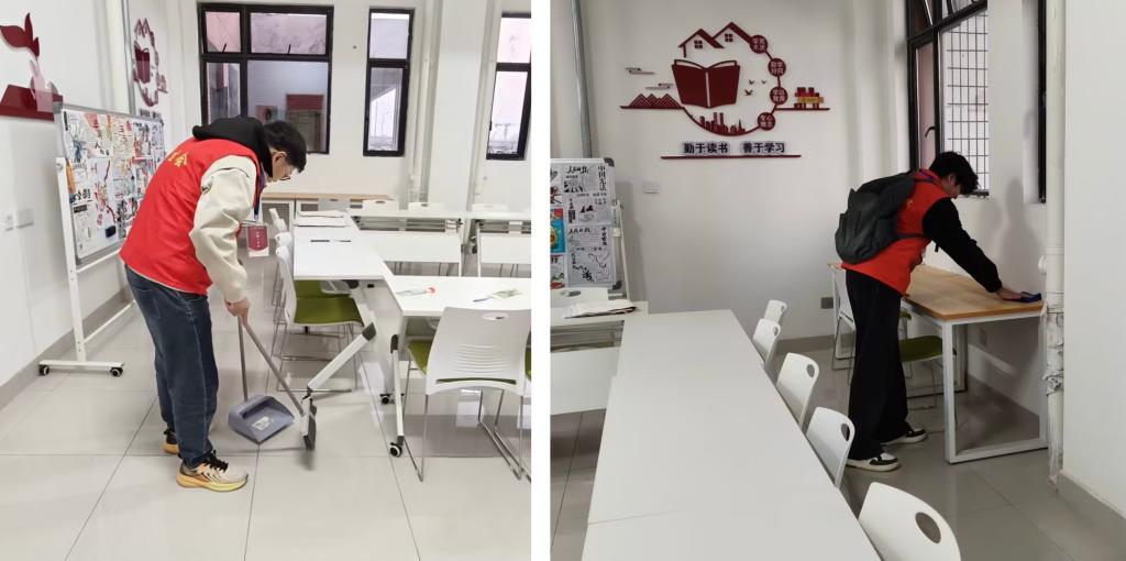 一站式学生社区内,志愿服务同样热火朝天。志愿者们分工清扫楼道走廊、公共活动室等区域,用扫帚清扫地面杂物,重点清理墙角缝隙、桌椅底部等卫生死角。另有学员化身“文明倡导员”,张贴“随手归位”“文明共享”等温馨提示卡,引导同学们共同维护社区环境。经过数小时奋战,社区公共区域焕然一新,为师生打造了整洁舒适的活动空间。